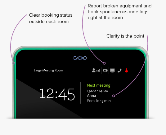 It doesn’t matter where you are. Book, cancel or extend a meeting in your own electroniccalendar or directly on the screen outside the meeting room. If the room is busy, Evoko Room Manager will tell you where the nearest room is available. The units synchronize with MS Exchange, Office 365 or Google Apps for Business to always show the latest information.